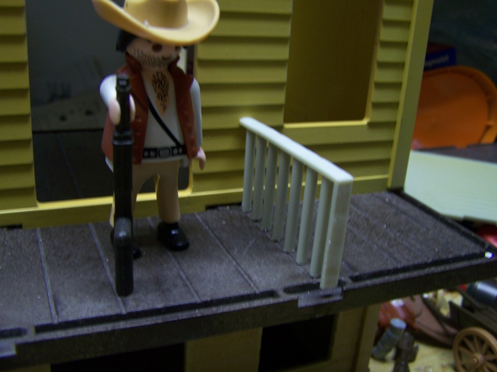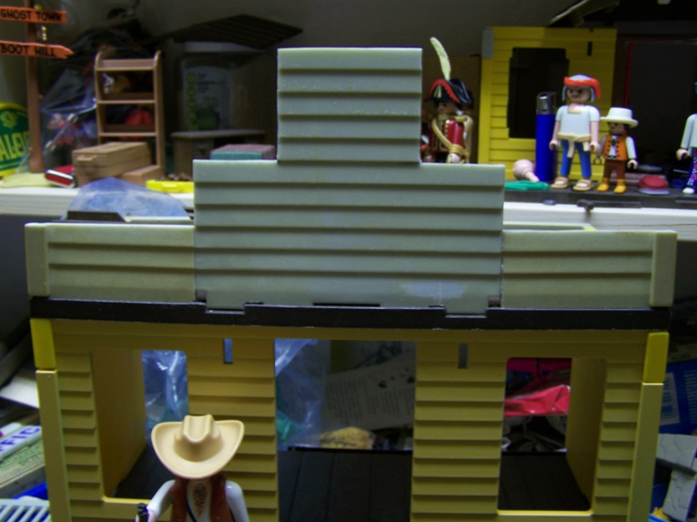 Es bekommt auch dieses schräge Vordach wie der Saloon,aber in der Mitte soll noch ein kleiner Balkon sein!