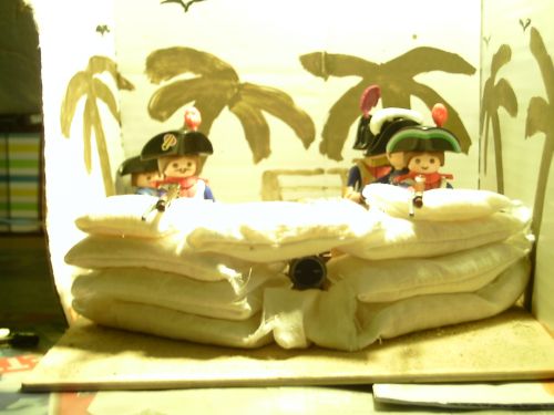 Stimmt, da kann man bestimmt noch ein paar kleine Details reinpacken! Vielleicht den Hintergrund noch ein bisschen pimpen, wobei das ja echt eine coole Idee ist mit den gemalten Palmen. Der Vordergrund mit der Sandsackstellung ist auf jeden Fall mal schon ganz großes Kino!