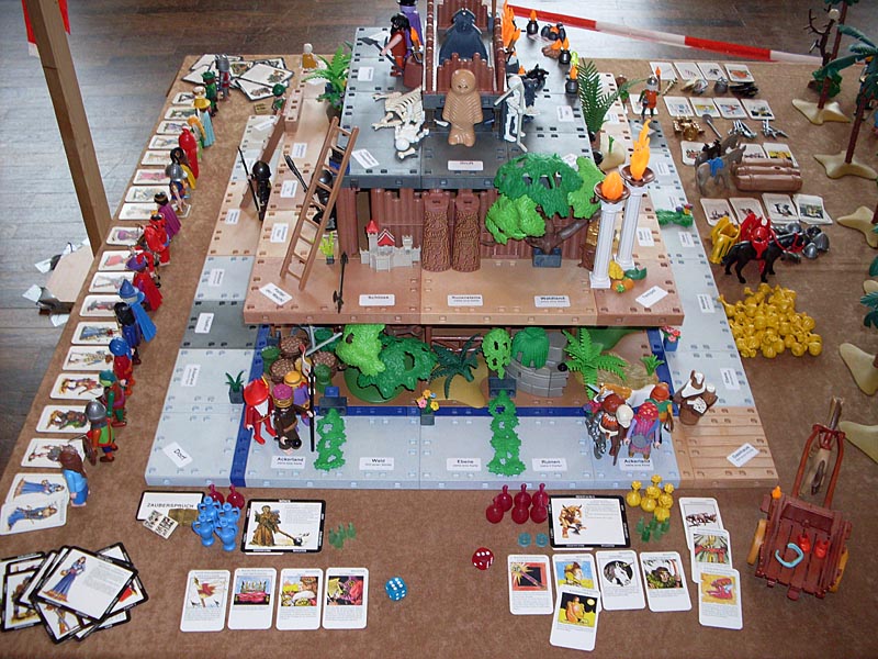 Charaktere vor und auf dem Spielplan. Die kleinen Kärtchen sind die Original-Pappaufsteller, mit denen man im Spiel zieht.