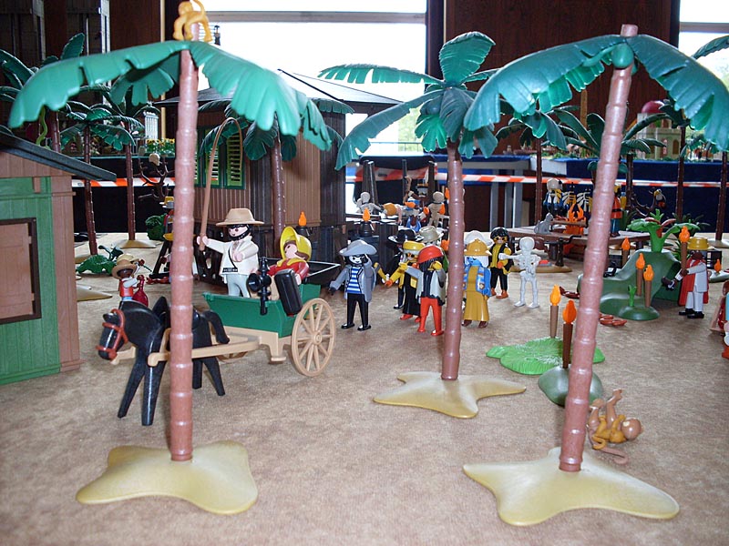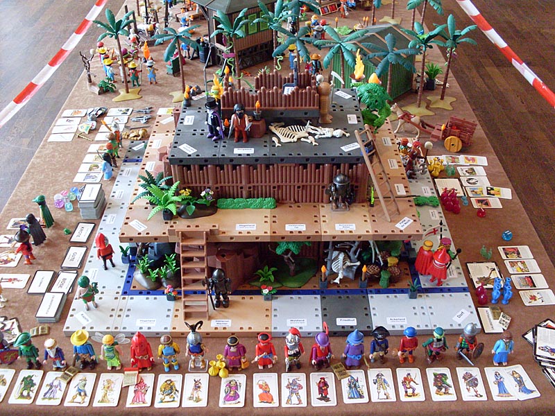 Der Spielplan im Original und als Playmobil-Version. Davor stehen die verschiedenen Charaktere, die man spielen kann.