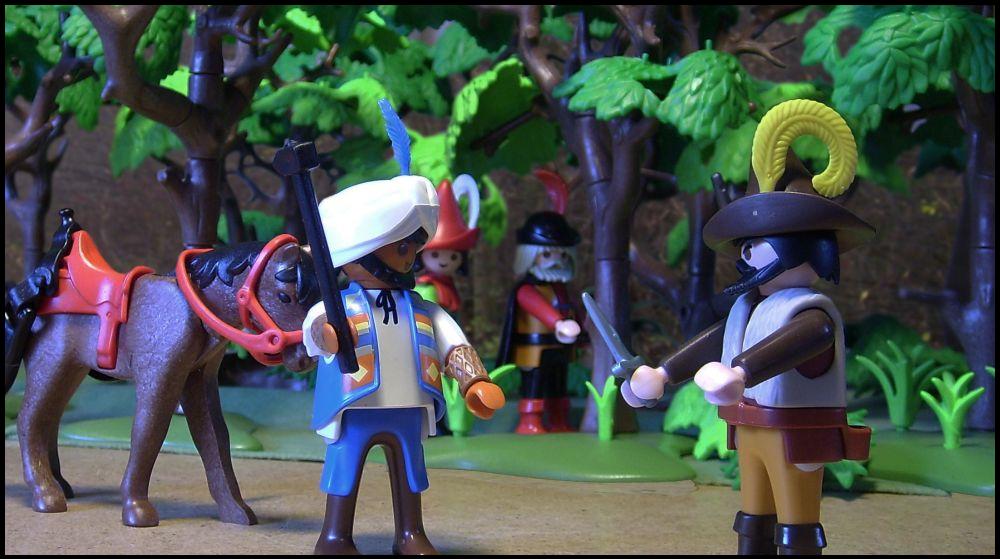 So schnell sie konnten, näherten sie sich dem unbekannten Rufer. Harim trieb sein Pferd noch mehr zur Eile an und erreichte auch als erster ihr Ziel. Mit einem Blick erfasste er das Geschehen. Drei Männer mit Waffen bedrohten zwei unbewaffnete Männer, die mit dem Rücken zu Harim und seinen Begleitern standen.