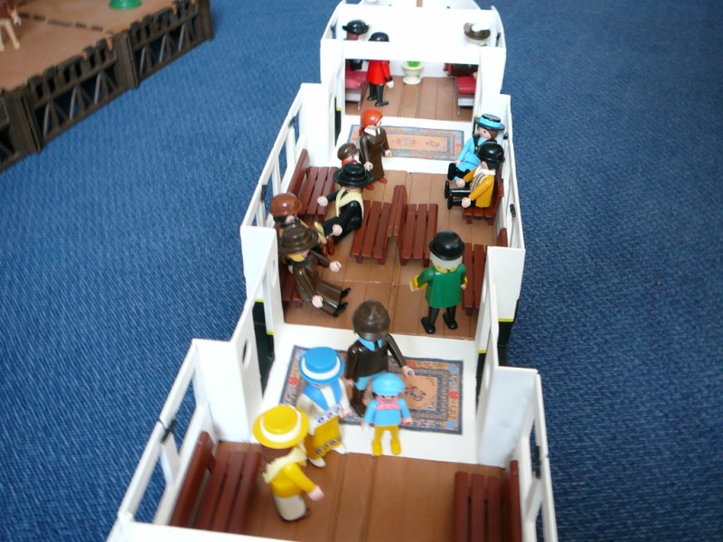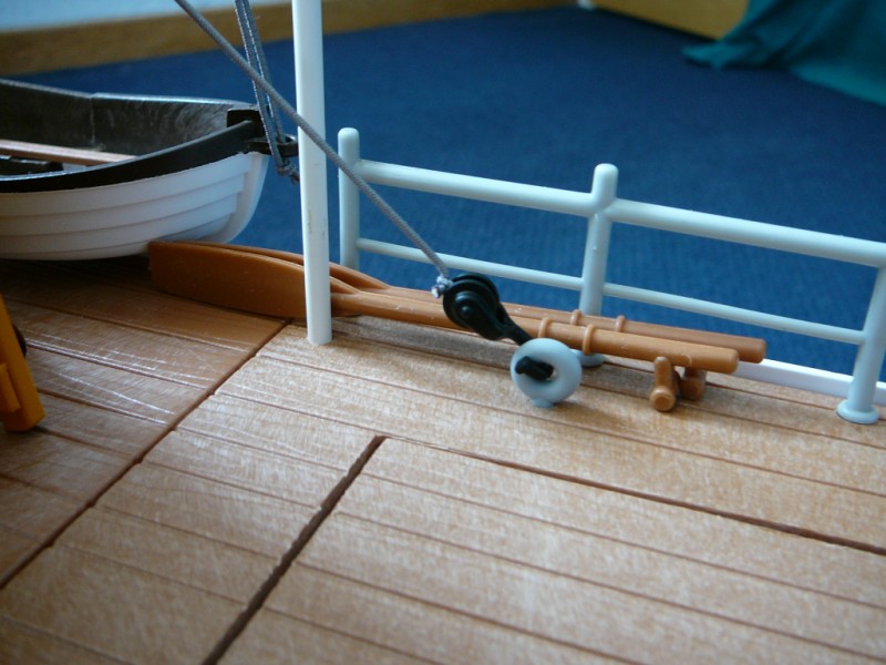 - Die Brücke besaß im Original ein abnehmbares, zeltähnliches Dach. Um das Schiff oben nicht noch wuchtiger werden zu lassen, hab ich darauf verzichtet, und der Kapitän darf Seeluft schnuppern...