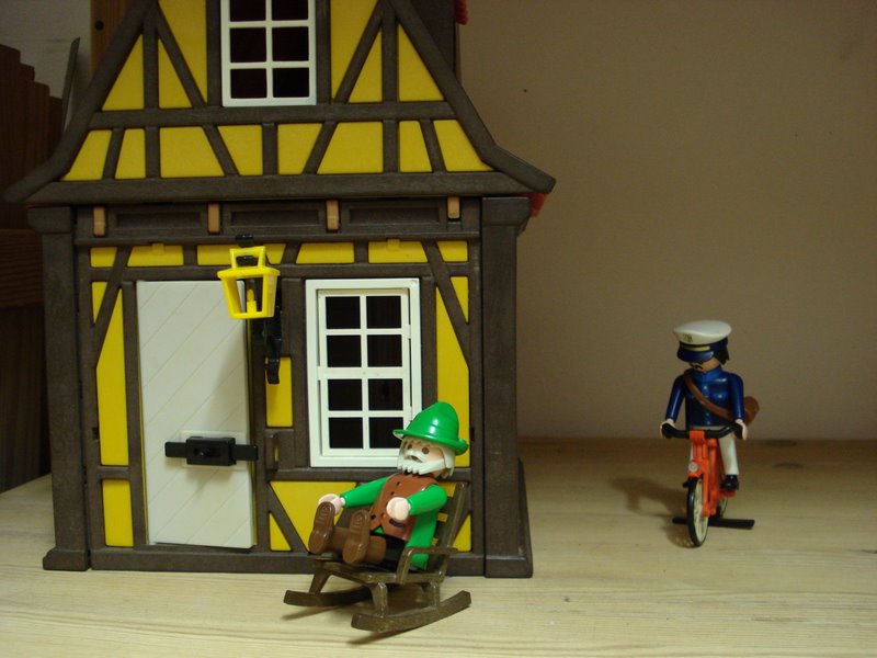 Postbote: "Grüß Gott, Herr Pumpernickel" (Grüß Gott Herr Pumpernickel) Pumpernickel Sen.: "Griaß Aich, Herr Mayer. Wie gohts na allaweil?" (Grüß Sie, Herr Mayer. Wie geht es Ihnen?) Postbote: "Guat, und Selbscht?" (Gut, und Selbst?) Pumpernickel Sen.: "Basst scho, ma Leabt halt..." (Ganz gut, man arrangiert sich) Postbote: "An Briaf hätt I für Ui, von aierm Bua." (Ich habe einen Brief für Sie, von ihrem Sohn) Pumpernickel Sen.: "Vergelts Gott, Herr Mayer." (Vielen Dank, Herr Mayer) Postbote: "Des basst scho Herr Pumpernickel, Pfiat Ihna" (Das ist schon in Ordnung, auf Wiedersehen) Pumpernickel Sen.: "Pfiat Ihna, Herr Mayer" (Auf Wiedersehen, Herr Mayer)