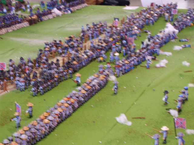 :gruebel Ich weis zwar jetzt nicht genau, welchen Teil der Schlacht das Dio darstellen soll, aber es schaut ein bisschen danach aus, dass die konföderierten Truppen gerade von Seminary Ridge aus auf die Nordstaatenstellungen vorrücken und an der Emmitsburg Road gestoppt werden. :nixweiss