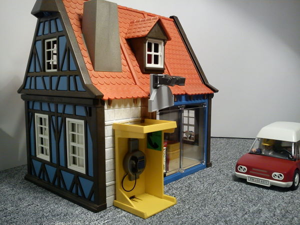Das blaue Fachwerkhaus mit Bäckereieinrichtung.