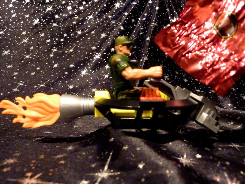 Sissi: „Uups, ich glaube ich habe gerade zehn oder fünfzehn davon abgeschossen!“ Mr. Jones: „Das ist alles völlig wirkungslos. Die Knilche greifen jetzt auch noch uns an“ Jedi brüllt in das Mikrocom: „Sissi, Süßes sonst Saures!“