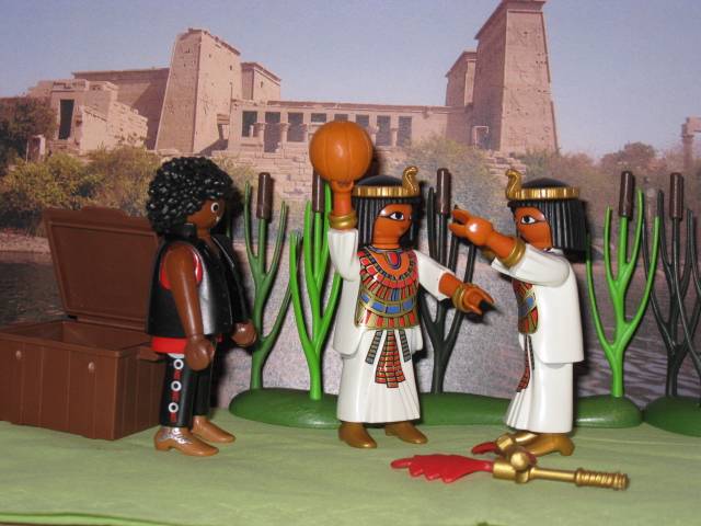"Sei gegrüßt, Amon Ra Mon!" sagt er, "Als Namensvetter unserer höchsten Gottheit gebührt dir unsere erlesenste Gastfreundschaft. Ich bin Pharao Karaokes. Dies ist meine geliebte Gemahlin Sinfonatra, und dies mein stattlicher Sohn Ptoblerones. Meine beiden entzückenden Zwillingstöchter hast du ja schon kennengelernt. Was führt dich zu uns?"