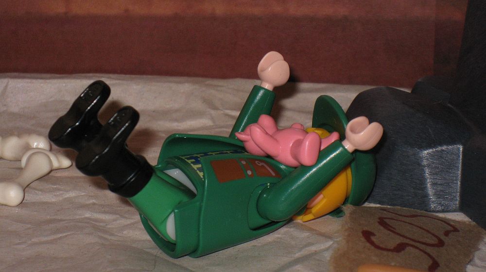 "FALSCHE ANTWORT!" brüllt Usi zurück, holt aus und wirft ihren steinharten Playmoteddy nach dem Mann.