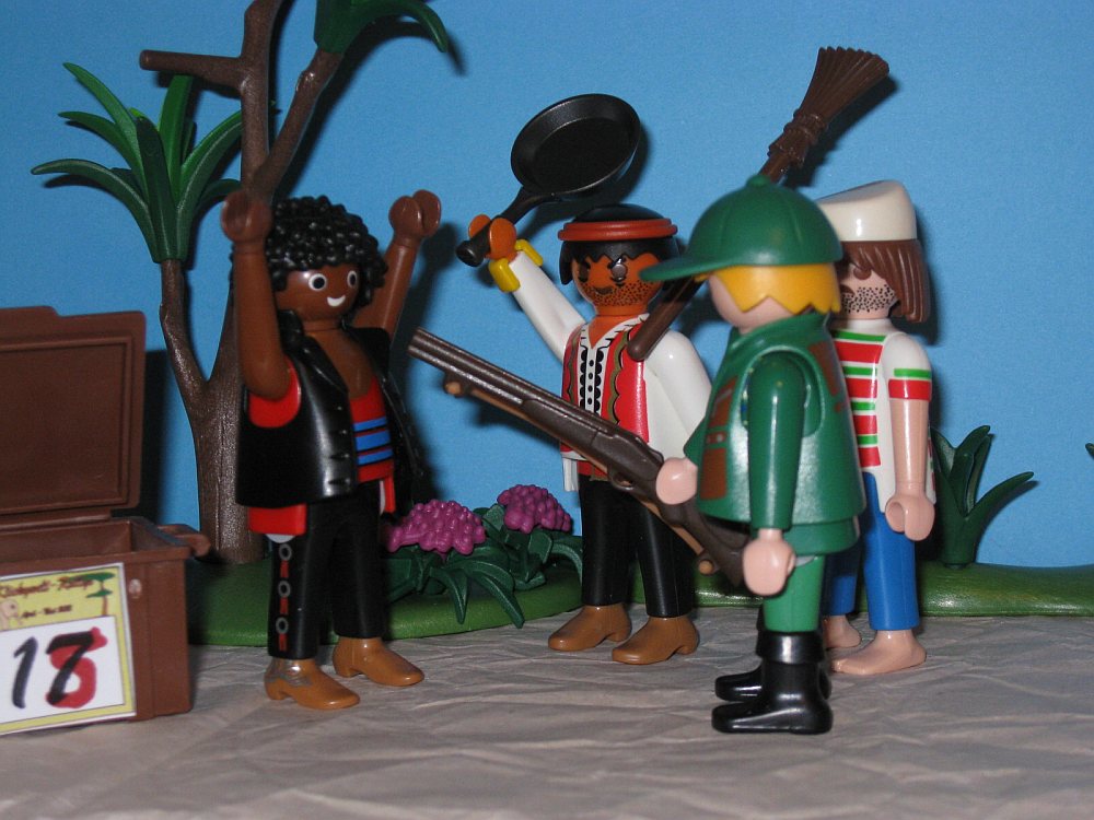 Vor der Faltbox steht Doktor Redlich, haargenau wie Usi ihn beschrieben hat. Als ordentlicher Bösewicht hat er inzwischen zwei tumbe Muskelmänner zur Verstärkung angeheuert. Leider hat er auch ein Gewehr dabei, das er auf Ramon richtet.