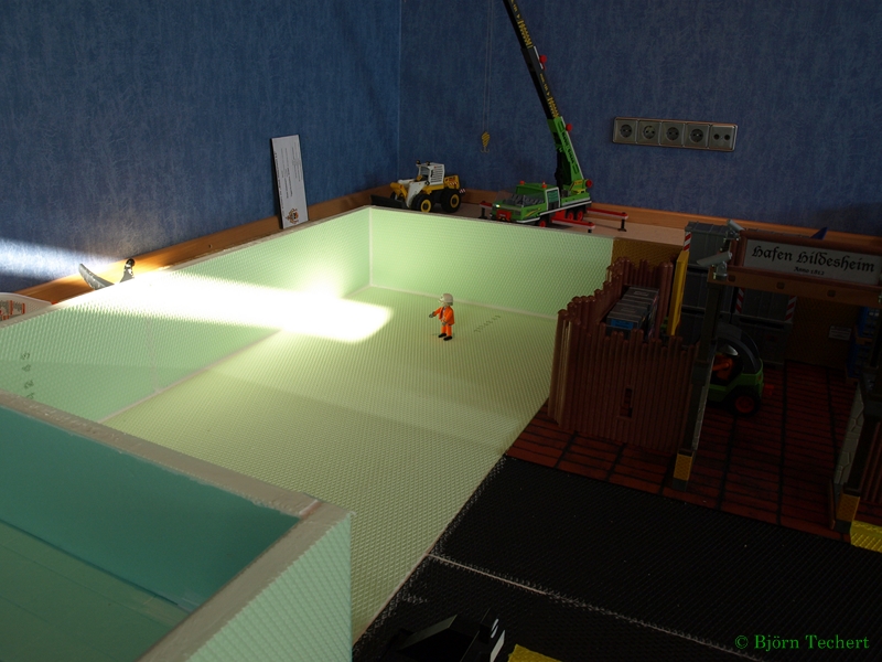 Sieht ja super aus Björn, aber eine Frage kommt bei mir schon auf: Was ist mit dem Hafenkai??? Die Frachtschiffe haben doch eine Höhe von mind. 15 cm, oder??? Deine Platten sind aber bei weitem nicht so hoch!!! Wie willst du dann den Tiefhafen realisieren??? Ins Laminat sägen???