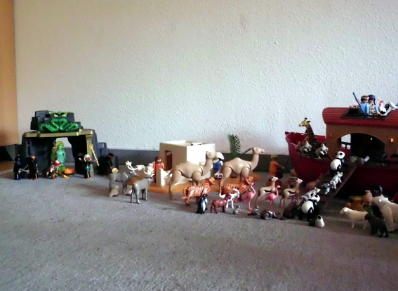 Heute hatte ich eine Riesengaudi im Kindergottesdienst! Erster Testlauf für meine Noah-Szene. Die Kinder haben begeistert mitgespielt und tolle eigene Ideen gehabt! Hatte leider keine Kamera dabei, und daheim hab ich noch Jericho aufgebaut. Bilder gibt's, wenn ich Jericho abgebaut habe.