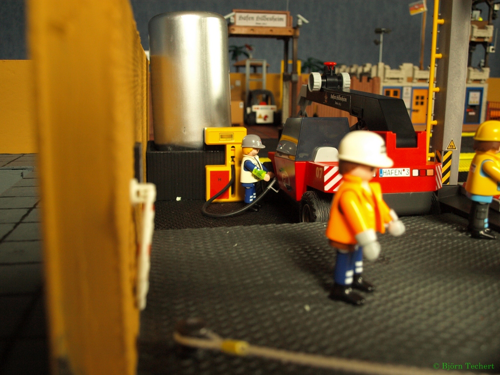 Der Reach-Stacker muss getankt werden. Natürlich fährt er mit hoch umweltfreundlichen, aus erneuerbaren Energiequellen gewonnen, Wasserstoff.