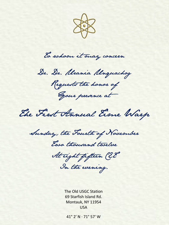 P. S. Betrachtet man das Logo auf Uranias Einladungsschreiben, so wird man rasch feststellen, dass ein Datenträger (engl. tag) im Logo integriert ist. Die Daten auf dem Träger berechtigen die Teilnehmer des ZEITSPRUNG-Rennens, die Kontrolle am Checkpoint Old USCG Station (Uranias Haus) von Montauk II zu passieren.