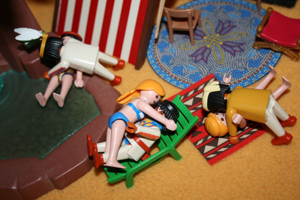 Während Lt. Jankee und seine britischen Freunde vor Sorge vergingen, feierten unsere drei Frauen(ua. Knusperkeks) eine kleine Poolparty, zusammen mit den Indio-Beduinen.(bitte vorstellen das zwei der drei Frauen im Bikini dunkelrote Haut haben, ich bin noch nicht dazu gekommen mir die entsprechenden Figuren zu holen)