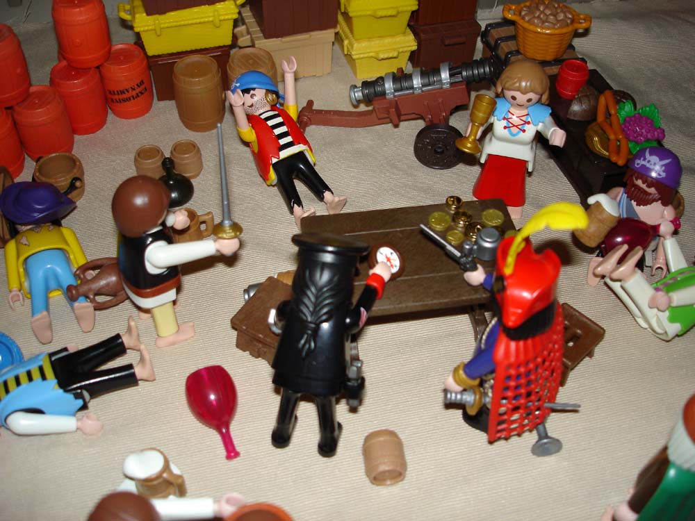 Der Pirat mit der roten Weste legt die Perle unter einen der drei Becher und „mischt“ diese dann schnell durcheinander. Jetzt wird darauf gewettet, wo sich die Perle befindet.