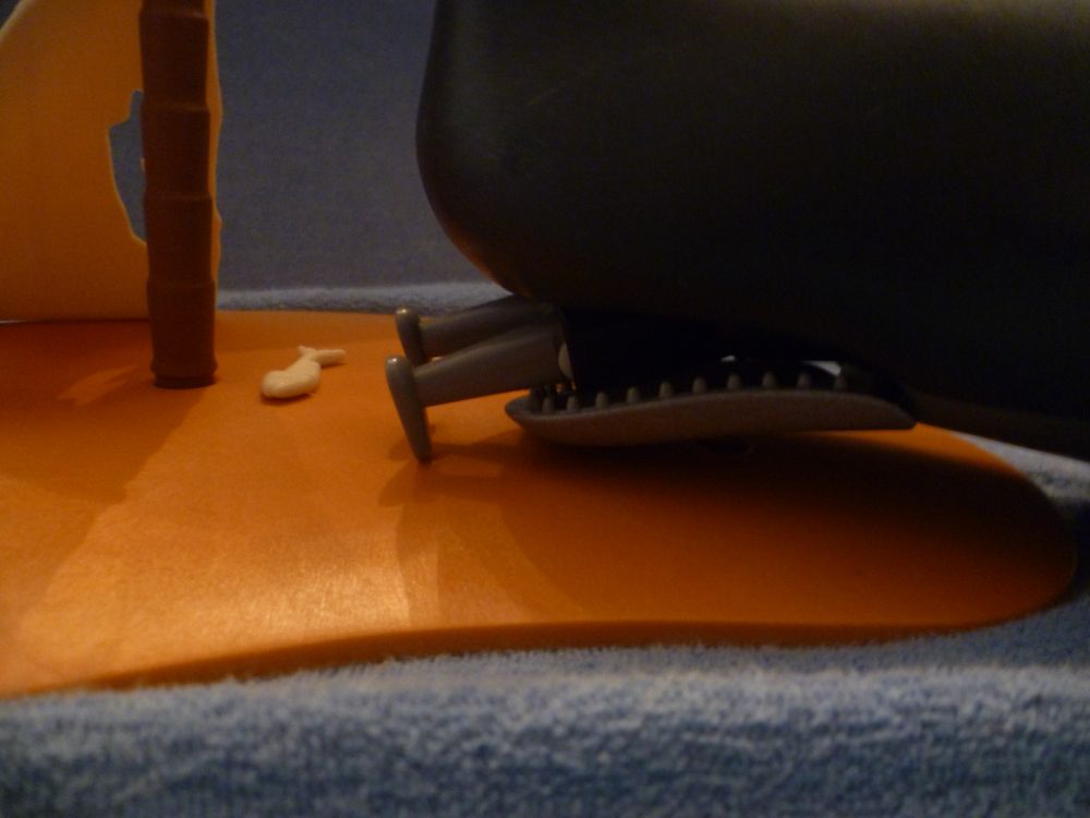 (Anmerkung der Red.: Der blaue Teppich stellt das Wasser dar, die Demontage der Räder soll das Einsinken des Plainwagons in das Wasser simulieren.)