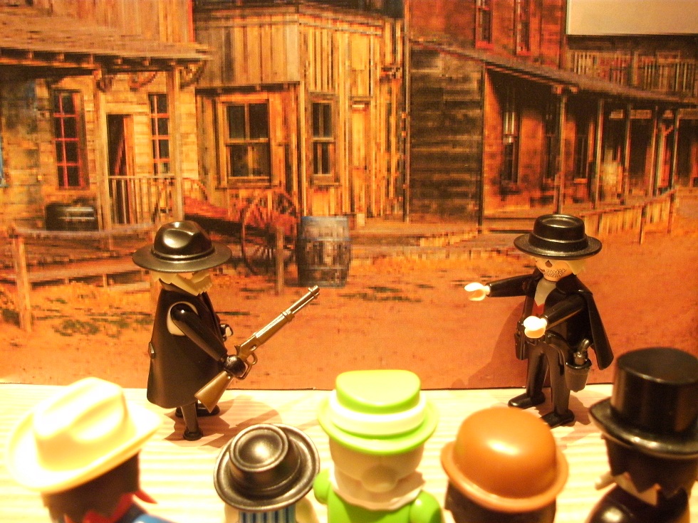 J.B.:"Nicht jetzt.., danach gehst du zum Saloon. Du erzählst den Bertie, das Tratschmaul, das ich mich Morgenmittag mit all den möchtegern Scharfschützen treffen werde. Am Ende der Stadt, um 12."