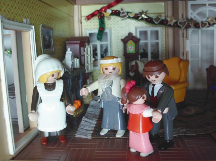 Umgesetzt habe ich diesen Gedanken in meinem Lieblingsambiente ... meinem Nostalgie-Puppenhaus zur Zeit von Agatha Christie, mit kräftigen Anleihen an den Weihnahtsklassiker "Ist das Leben nicht schön?" Ursprünglich geplant als Beamer-Präsentation, zu der die Kinder den Text lesen (wie gesagt ... Probenmarathon so kurz nach meinem Bibelevent ...), waren die Kinder so begeistert von dem Stück, dass sie es unbedingt spielen wollten! So habe ich den Anfang als Erzählversion mit Beamerbildern gelassen und den Rest als Theaterversion umgeschrieben.