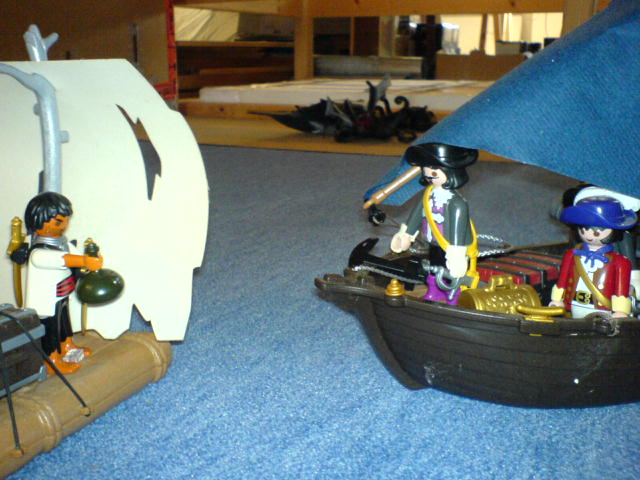 und spielt den Lockvogel: "Ahoi Kanonensegler, ahoi! Wir sind Rumschmuggler. Wollt Ihr Rum tauschen?"