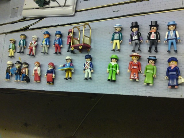 Gut, die Wirkung ist auf dem Photo nur bedingt zu sehen, aber die letzten beiden Glühbirnen sind aufgehängt (in den Salons des Grand-Hotels), die beiden neuen Türen montiert und das Dach fertig. Damit stehen die Gebäude bis auf die Beschilderungen fix und fertig.