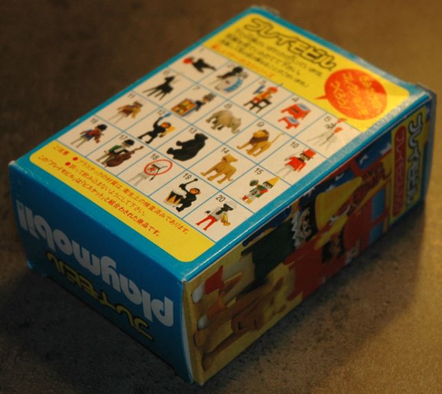 Einer der schönste Verpackungen aus meiner Sammlung. Diese Set kommt aus Japan und wurde durch die Japanische Firma Meiji (Fabrikant von Keksen und Pralinen) hergestellt. Es gab sicher 5 verschiedene Serien mit Playmobil Verpackungen mit jeweils 20 verschiedene Sets. Jede Set hat ein Aufkleber worauf die Inhalt zu sehen war. Diese Serien waren vermutlich nicht lange im Handel und wurden in die achtziger Jahren in Zusammenhang mit Keksen Verpackungen verkauft. Die Verpackungen waren besonders original, aber sind leider sehr schwer zu finden.