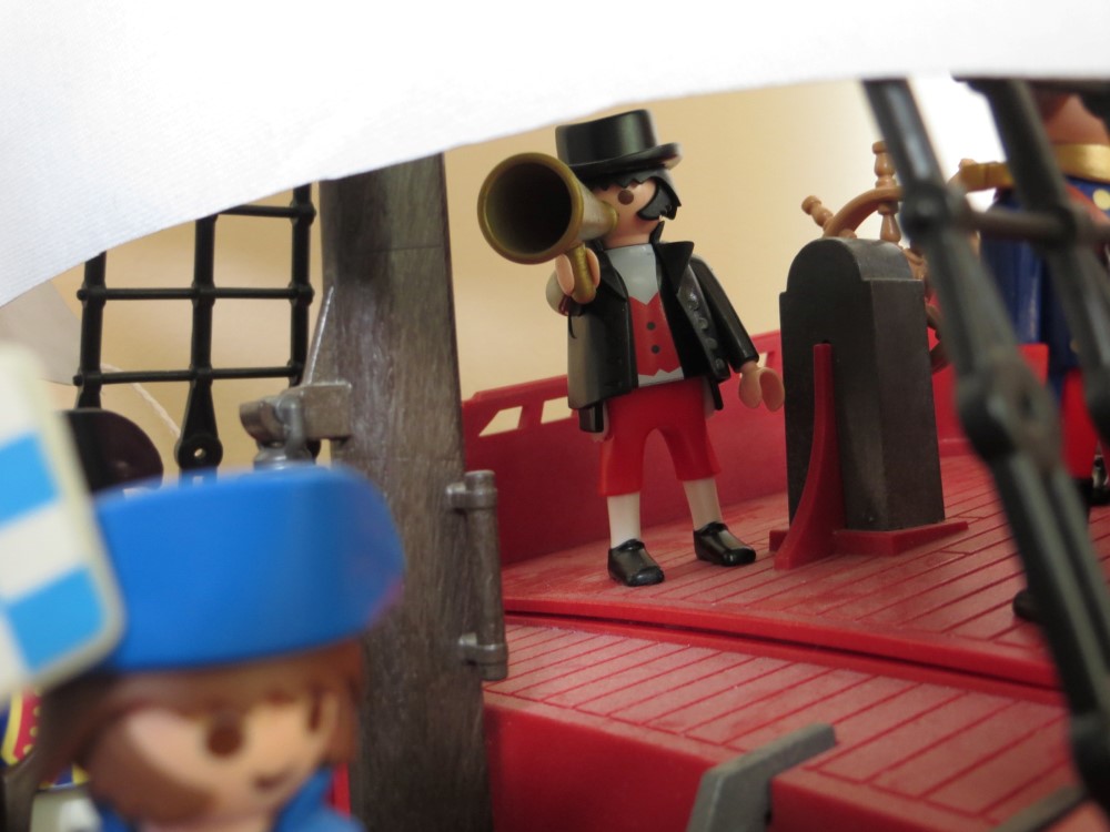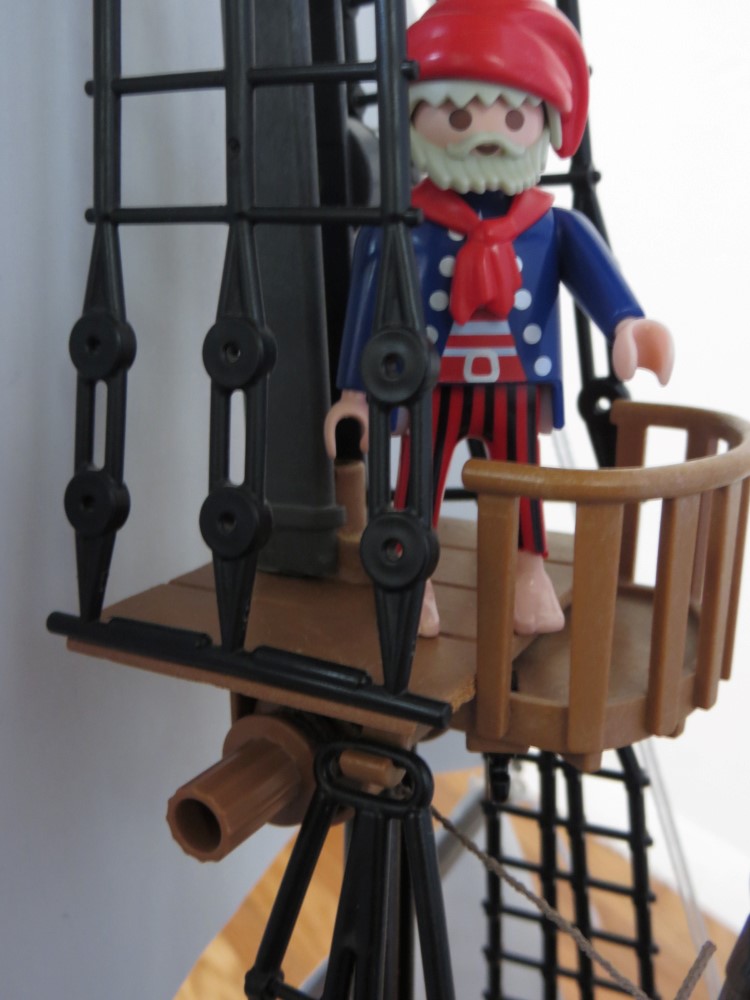 Die Masten des Piratentarnschiffs auf einem 3940er Rumpf lassen das Schiff schon deutlich groesser wirken. Inspiriert auch von Marco Sniders "HMS Renown" (http://www.klickywelt.de/piraten-regatt ... 22221.html), das eigentlich schon ganz gut wirkt, habe ich versucht, die Segelkomponente noch mehr ins Spiel zu bringen.