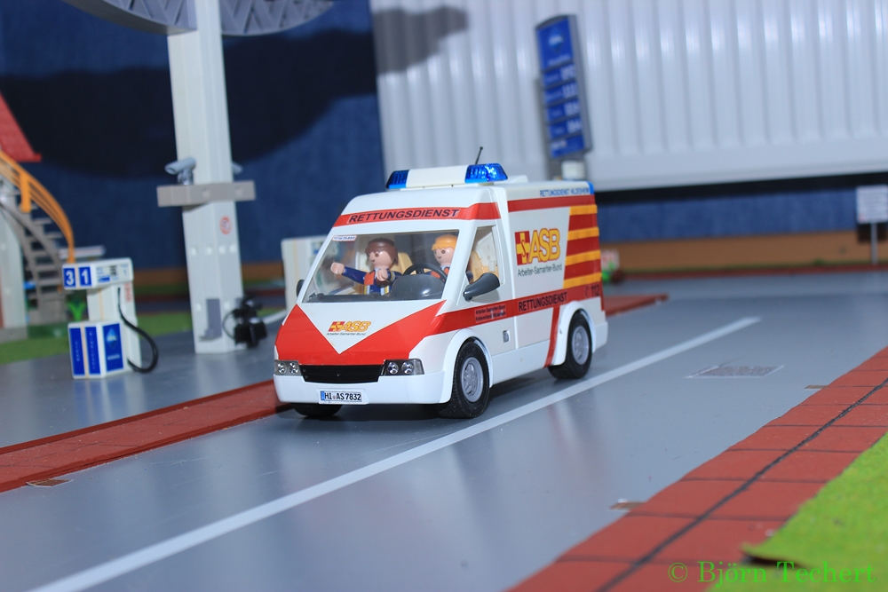 Mit Blaulicht und Sondersignal rückt ein Rettungswagen des ASB an.