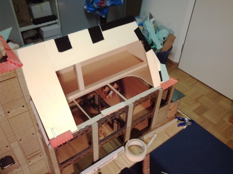 Baufortschritt: Auf der Rückseite wurde der Dachrahmen begonnen. Hier wird das Dach allerdings in der Mitte offen bleiben, um einen besseren Einblick zu ermöglichen. Mal sehen, ob ich nachher Bilder dazu einstellen werden können.