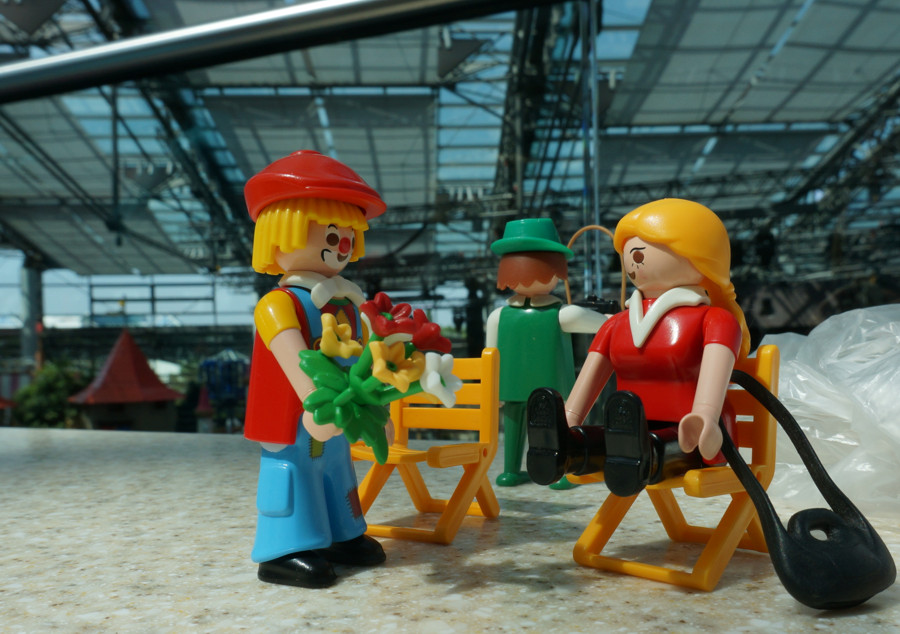 Seinen Blumenstrauß hat er vorsichtig zur Seite gelegt und die beiden Blondinen,