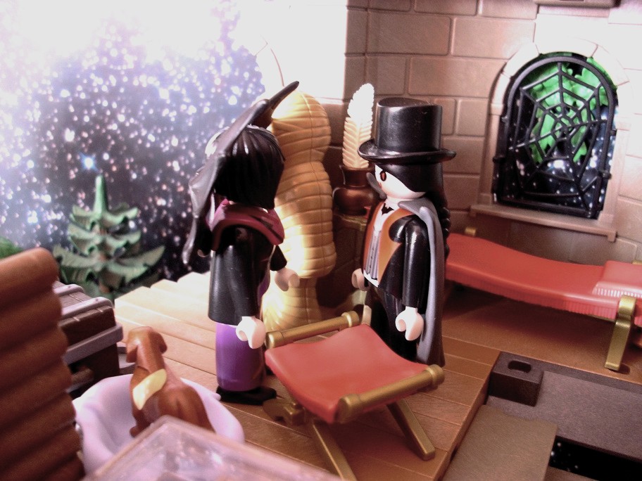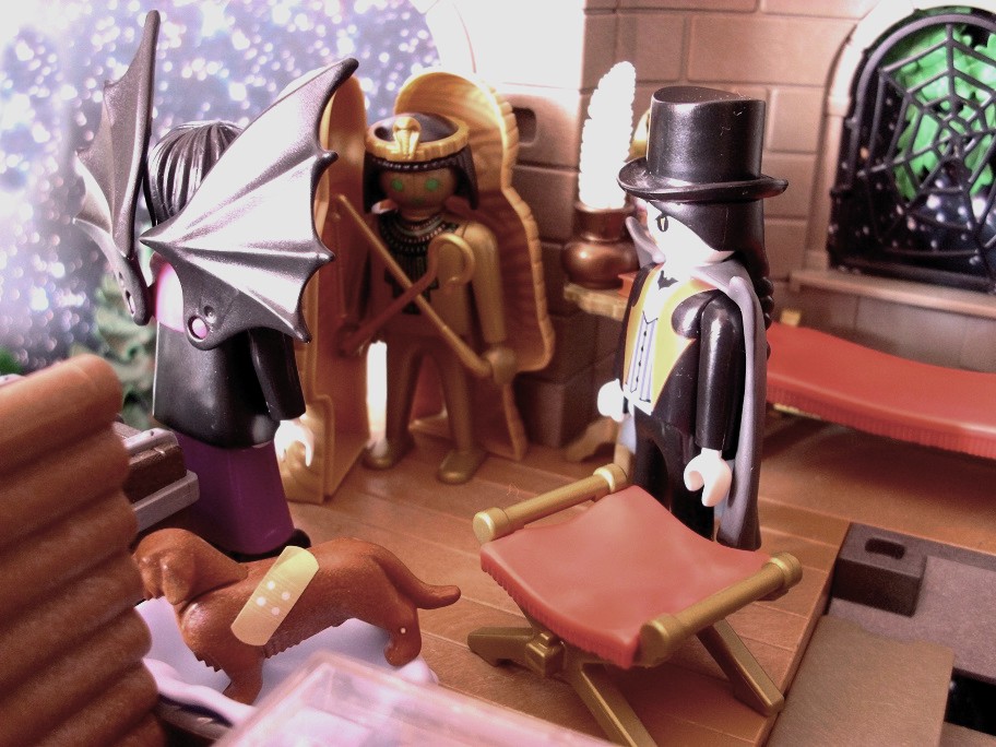 Vlad: „Ist doch eine nette Gegend hier. Und unsere Ruine zerfällt jede Nacht ein wenig mehr und sieht immer anders aus.“ Betty: „Das ist es nicht. Ich würde gern mal wieder unter Leute kommen. Der einzige Besuch, den wir hier haben, ist der wahnsinnige Wissenschaftler von Nebenan und das Essen. Und nicht einmal mit dem Essen kann man noch reden!“