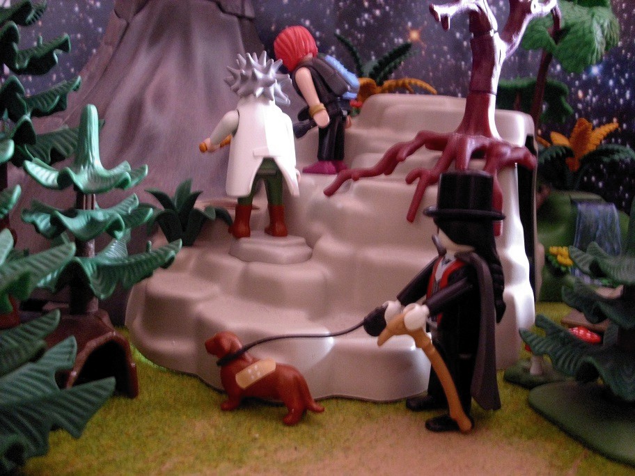 Vlad: „Velociraptor“ Betty: „Ach nein! Nicht schon wieder Instantpackungen von Dr. Evil! Hey, wir haben Igor behalten, weil Du gesagt hast, so locken wir leichter Beute an. Und nun, müssen wir Abends und morgens mit ihm raus und es gibt doch nur Saurierblut!“
