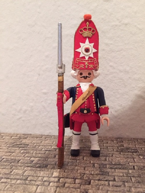 Nachdem ich immer wieder nur mit dem Gedanken gespielt hatte, die Königsgarde Friedrich Wilhelms I. oder einfach "Die langen Kerls" zu bauen, habe ich mich dann doch endlich hingesetzt und etwas rummodelliert. Das Ergebnis seht Ihr nun hier. Wobei dies die Erste von insgesamt 150 Figuren ist. Weitere 6 sind bereits in Arbeit, bekommen aber etwas andere Beine um ihrem Namen "Lange Kerls" auch gerecht zu werden.