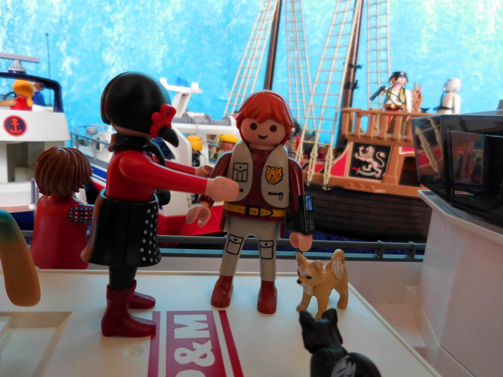 Ihre Kanone deutet aufs Schiff. Die Piraten weichen auf die andere Seite zurück.