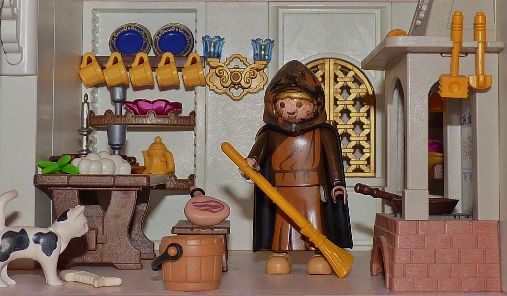 Sie war aber in ihr Ställchen gelaufen, hatte geschwind ihr Kleid ausgezogen, Gesicht und Hände schwarz gemacht und den Pelzmantel umgetan, und war wieder Allerleirauh. Als sie nun in die Küche kam und an ihre Arbeit gehen und die Asche zusammenkehren wollte, sprach der Koch: „Lass das gut sein bis morgen und koche mir da die Suppe für den König, ich will auch einmal ein bisschen oben zugucken; aber lass mir kein Haar hineinfallen, sonst kriegst du in Zukunft nichts mehr zu essen.“