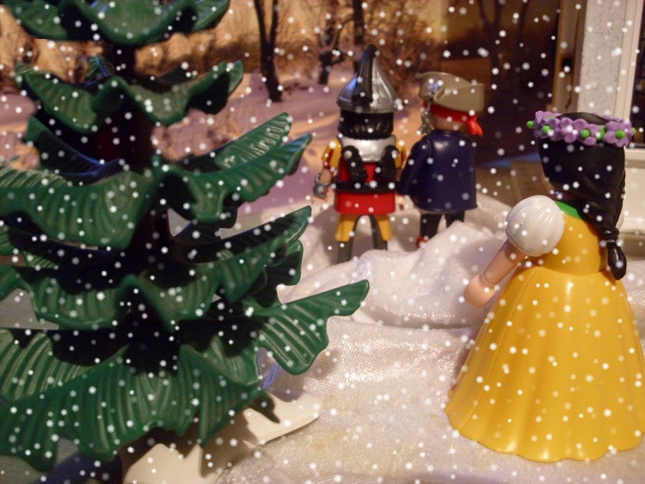 Der Schnee wird immer dichter. Und gerade als Sonnenschein ihren Vater mit dem Bäumchen trifft, begegnen sie zwei Fremden im aufkommenden Schnee. „Seid gegrüßt. Wer seid ihr denn?“ erkundigt sich König Blitz.