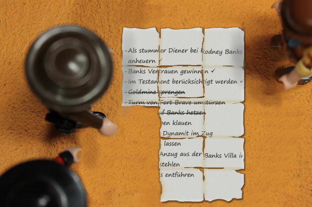 Ihre einzigen Hinweise auf den Aufenthaltsort des Banditen, waren mehrere Zettel, die sie unterwegs in verschiedenen Geisterstädten gefunden hatten.