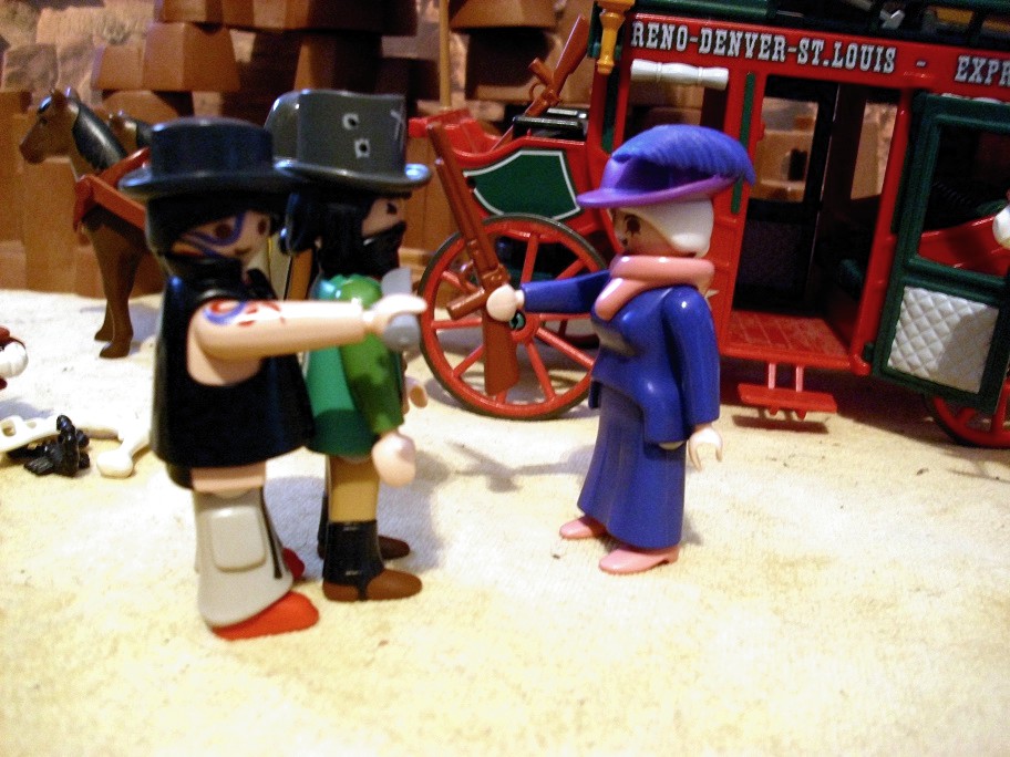 In dem Augenblick wird ihr Gespräch unterbrochen. Von draußen hören sie Pferde, Gewehrschüsse und Rufe. Die beiden Passagiere schauen aus dem Fenster und erkennen zwei maskierte Männer, die auf ihren Pferden die Kutsche bereits eingeholt haben.