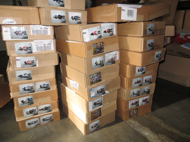 Die Einheiten, die nicht in den Vitrinen stehen, kommen in Kartons. Mittlerweile muss ich immer etliche aufmachen, um zu sehen, was darin ist. Daher habe ich Bilder des Inhalts gemacht, in Farbe gedruckt, laminiert und aussen mit Klebeband angebracht.