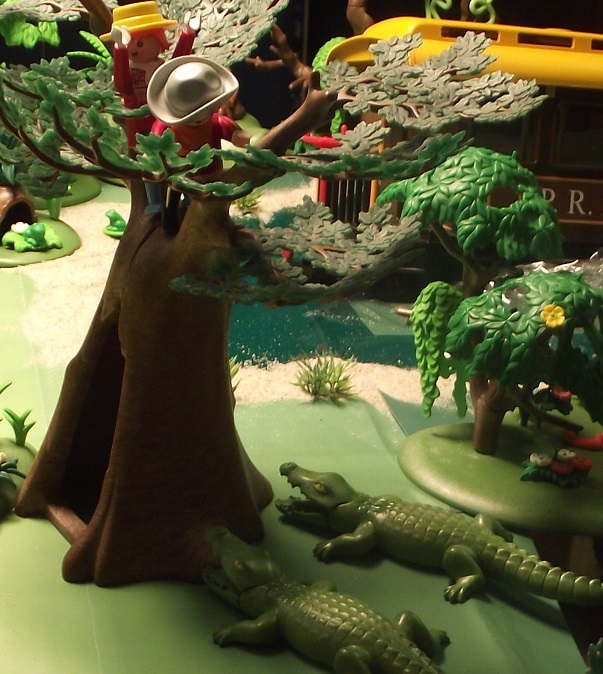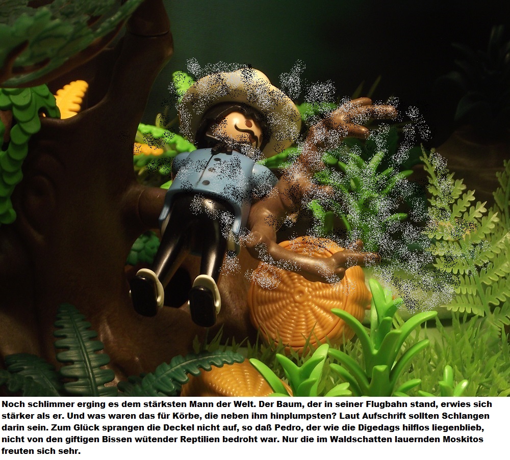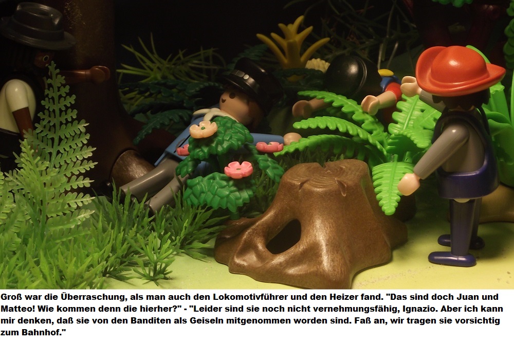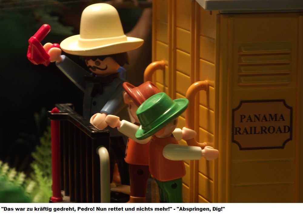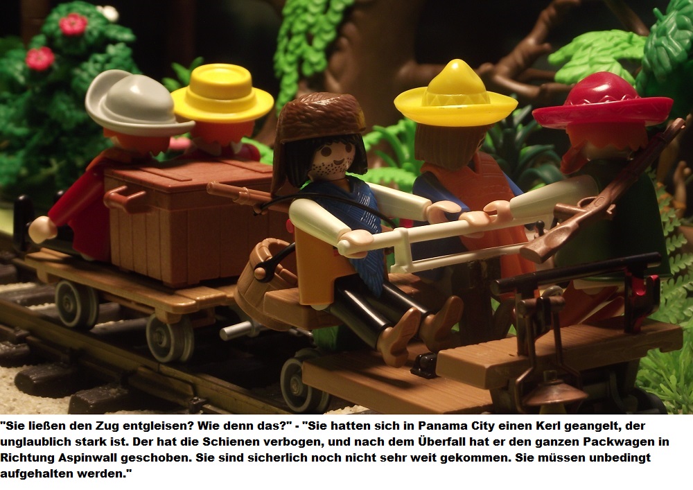 In der vorangegangen Folge, wurden die Digedags und alle Mitreisenden des Dschungelexpress auf dem Weg von Panama nach Aspinwall, Opfer eines gemeinen Überfalls auf den Zug. Gemeine Banditen hatten die Gleise manipuliert und somit den Zug in einen Sumpf geleitet. Dummer weise wurden die beiden Gauner von flüchtenden Alligatoren auf einen Baum gejagt und konnten den Überfall nicht vollenden. Dank Pedro, dem stärksten Mann der Welt, gelang es den Gepäckwagen zu retten, die Gleise zu richten und mit dem Wagen die Reise fort zu setzen.