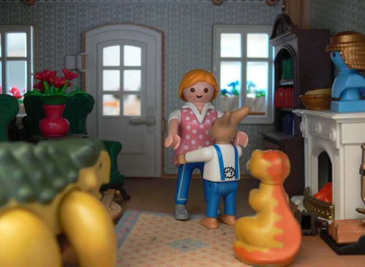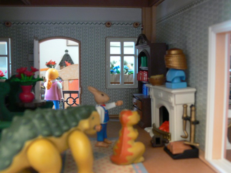 "Hier ist niemand. Aber diese Möbel kommen mir bekannt vor. Lass uns auf der anderen Seite nachsehen", schlägt Möhrchen vor.