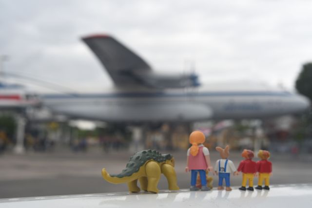 Jetzt sehen die Dinos zum ersten Mal das Flugzeug, mit dem wir fliegen werden.