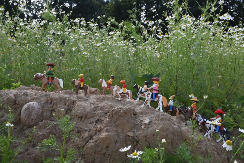 Wir sind mittlerweile bei den Pferden angekommen. Möhrchen geht schnurstracks zwischen ihnen durch.