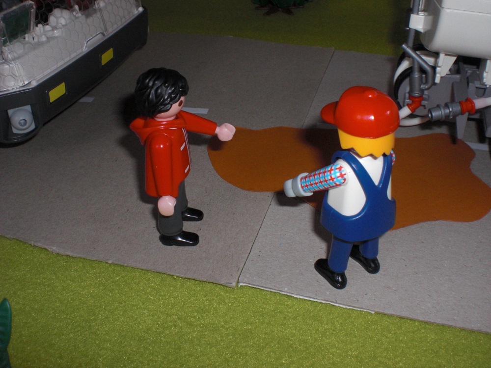 „Keine Ahnung, aber das ist auch nicht mein Problem.“, antwortet der Tankwagenfahrer genervt.