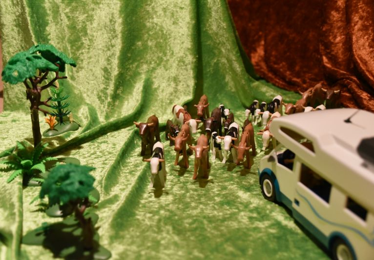 Ich konzentriere mich aufs Fahren und die Dinos erzählen alle gleichzeitig von ihrer Reise mit den Blauschopf-Alpakas.