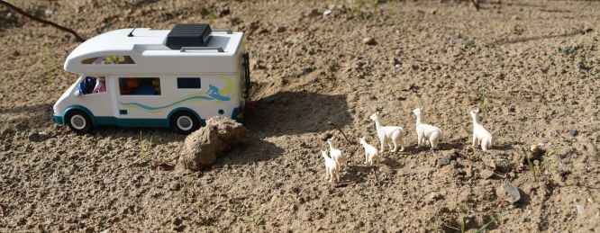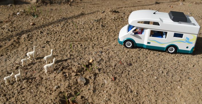 Wir folgen der Warnung der Alpakas, setzen uns wieder ins Wohnmobil und fahren weiter. Die Alpakas sehen uns noch eine Weile hinterher.