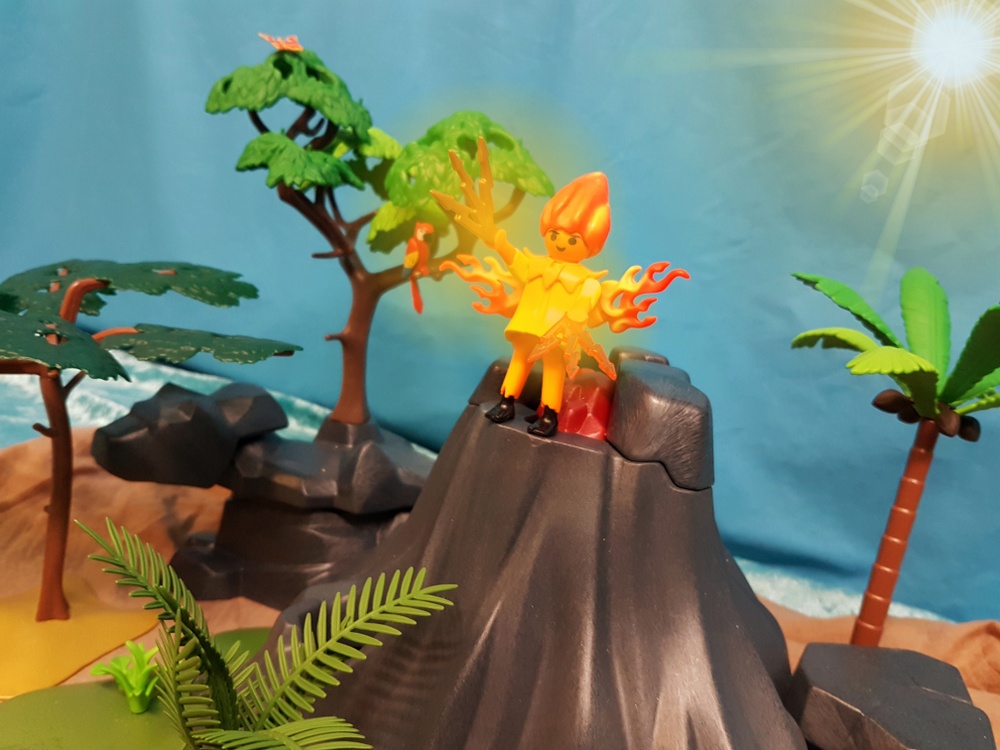 Aber, wie kam der auf einmal so plötzlich auf den Vulkan? Ob dies etwas mit dem Unwahrscheinlichkeitsfaktor der Waffen zu tun hat? Doch dann hat Flammbada auf einmal eine Würfelqualle in der Hand. Sie hebt die Qualle hoch, zielt und wirft ... ... und - autsch! - reißt mich ein hart gezielter Rosenstrauß von den Beinen. Nachdem ich mich wieder berappelt habe, nehmen wir das Feuer wieder auf. Und diesmal klatscht eine dicke Würfelqualle Flammbada ins Gesicht. Ein lautes Zischen ertönt, als das schleimige, nasse, giftige Viech auf die Flamme trifft. Mit einem lauten Schrei stürzt Flammbada in den Krater. "Sieg!" jubeln wir. Danach schaue ich verunsichert auf die Waffen. "Dieser Unwahrscheinlichkeitsfaktor verunsichert mich völlig. Da kann ja buchstäblich ALLES passieren!"