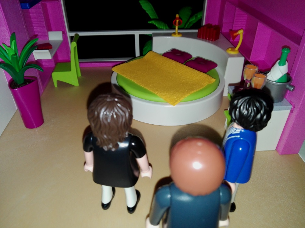 Dann gehen die drei zurück ins Schlafzimmer, wo eine Flasche Sekt inklusive Gläser bereit steht.