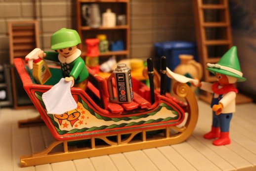 Die Elfen beladen den großen Schlitten mit den Geschenken.