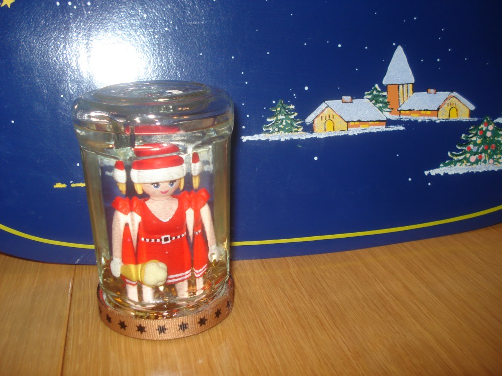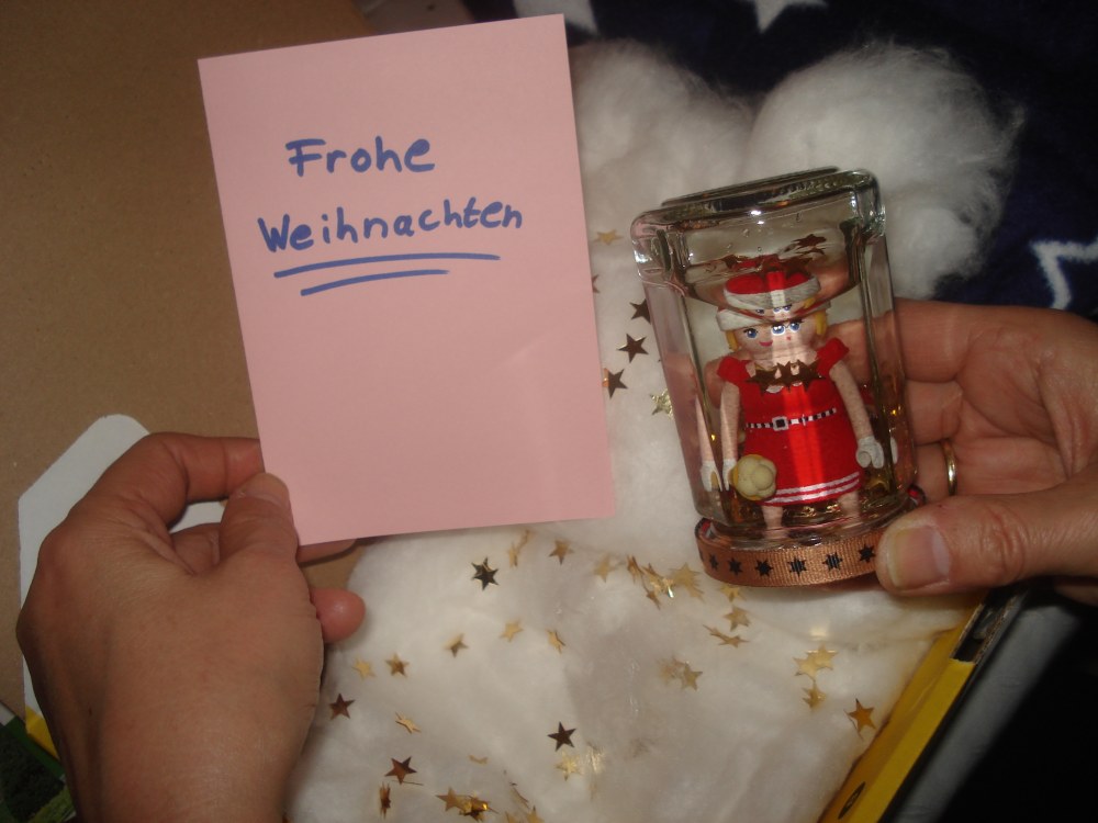 Wunderbar in Watte gehüllt und in goldene Sternchen gebettet, lag ein Glas mit einer hübschen Weihnachtsfrau im Paket.