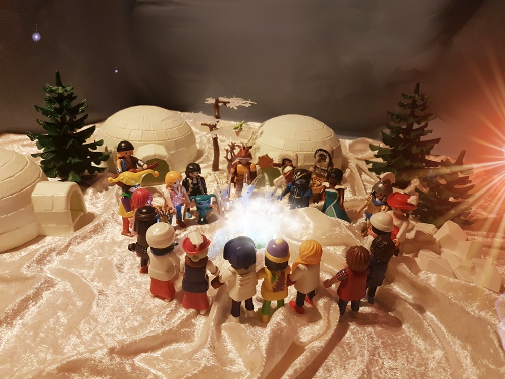 Bei Sonnenuntergang erreichen wir den Heiligen Ort der Inuit, an dem die Eiskugel wieder zusammengesetzt werden soll. Die anderen Rallyeteams erwarten uns schon mit ihren Bruchstücken der großen Eiskugel.